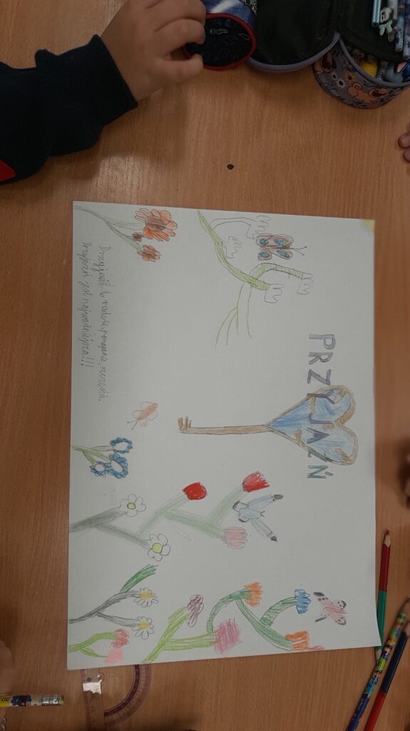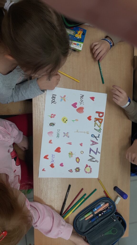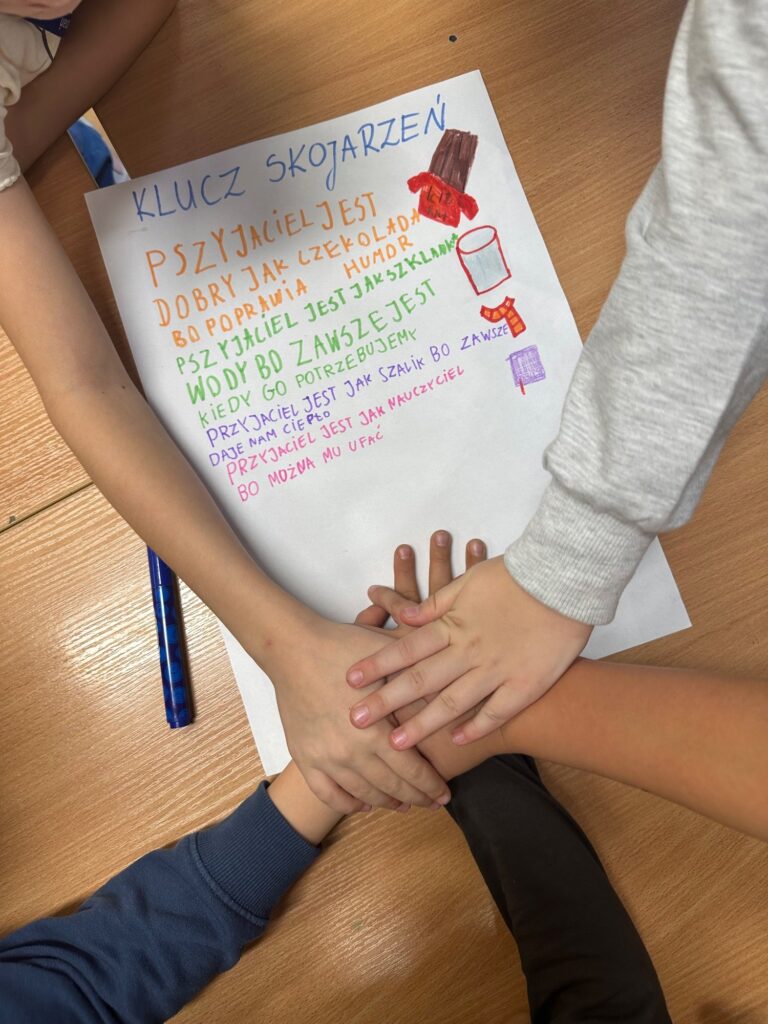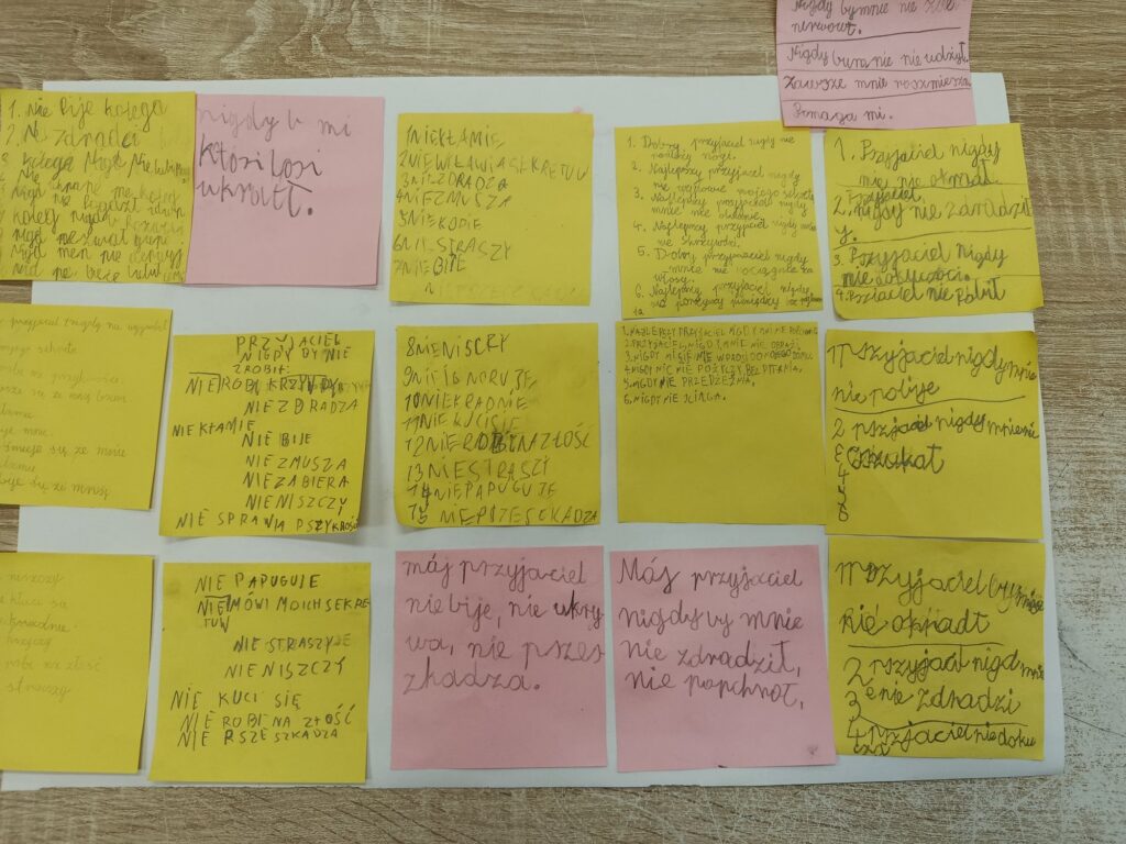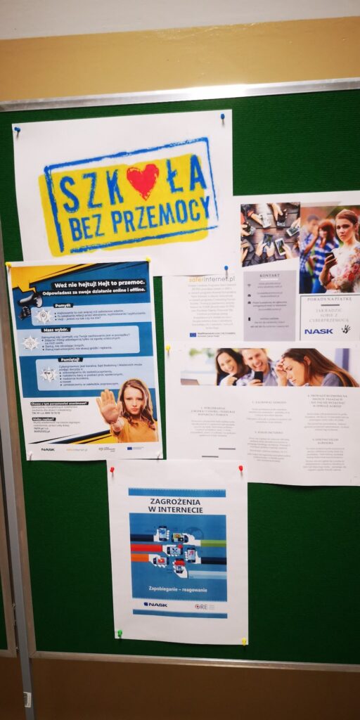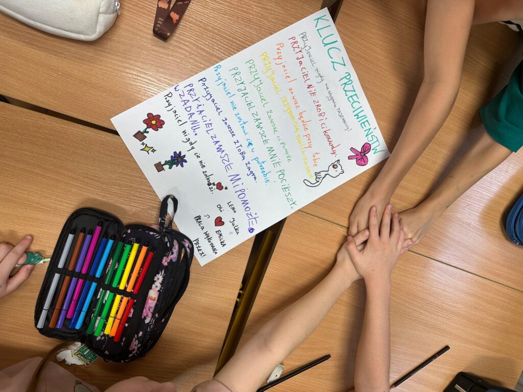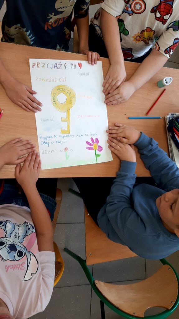 Nasi uczniowie zapoznali się ze ścieżką pomocy dla uczniów – jak działać w sytuacji przemocy rówieśniczej w szkole, jak zapobiegać i jak reagować na cyberprzemoc, jak reagować na hejt. Uczniowie tworzyli „plakaty przyjaźni”, „charakterystyki najlepszego przyjaciela”, „klucze przyjaźni”, „miłe słowa”.