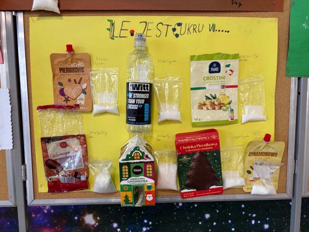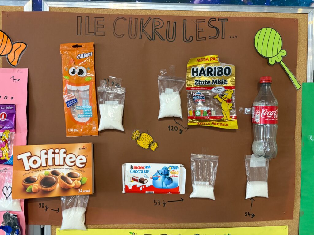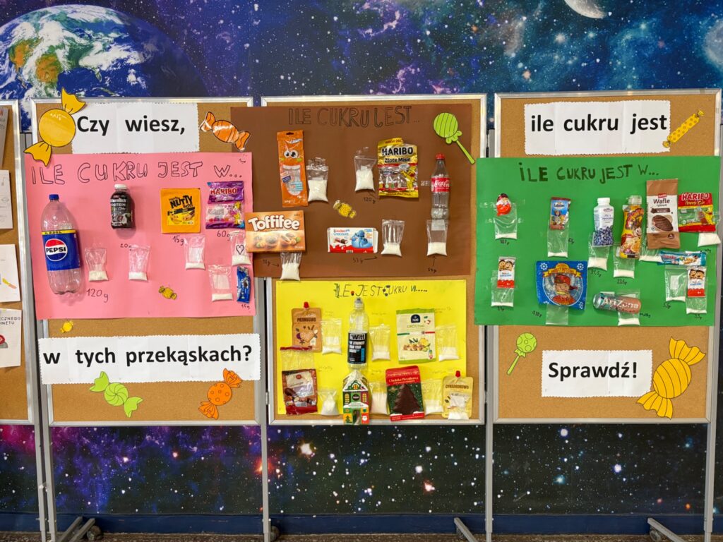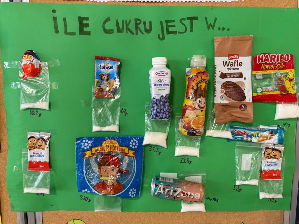 W szkolnym holu powstała wyjątkowa wystawa poświęcona zawartości cukru w popularnych przekąskach i napojach. Uczniowie klas 4 i 5 podczas zajęć edukacji zdrowotnej samodzielnie analizowali etykiety produktów, obliczali ilość cukru, a następnie obrazowali ją przez odmierzenie cukru w woreczkach strunowych.