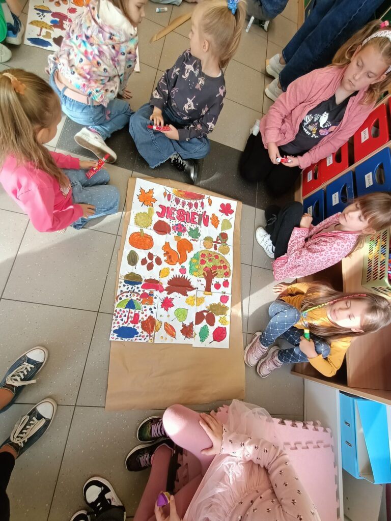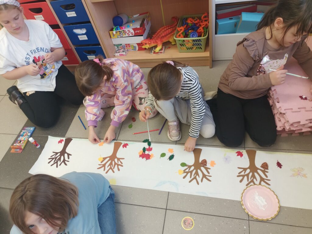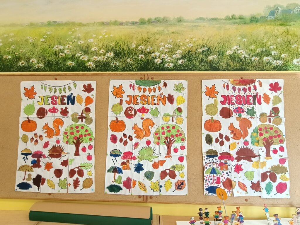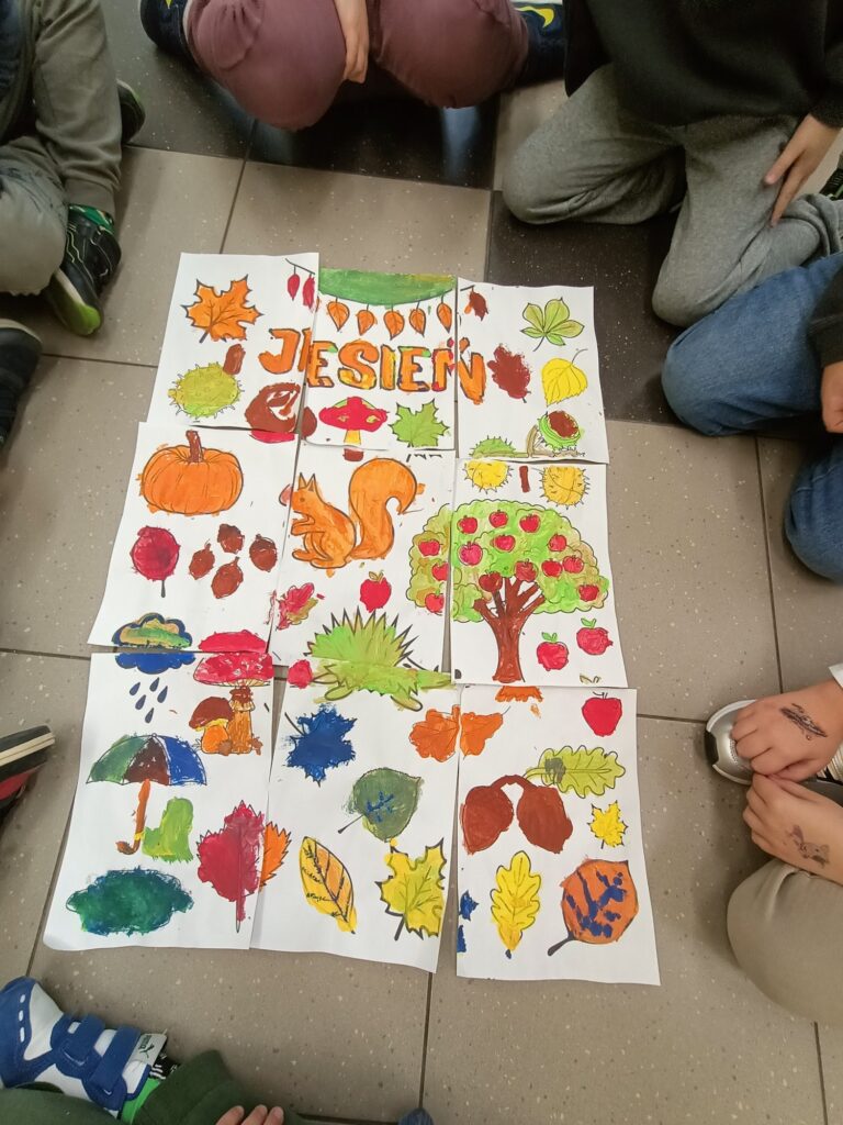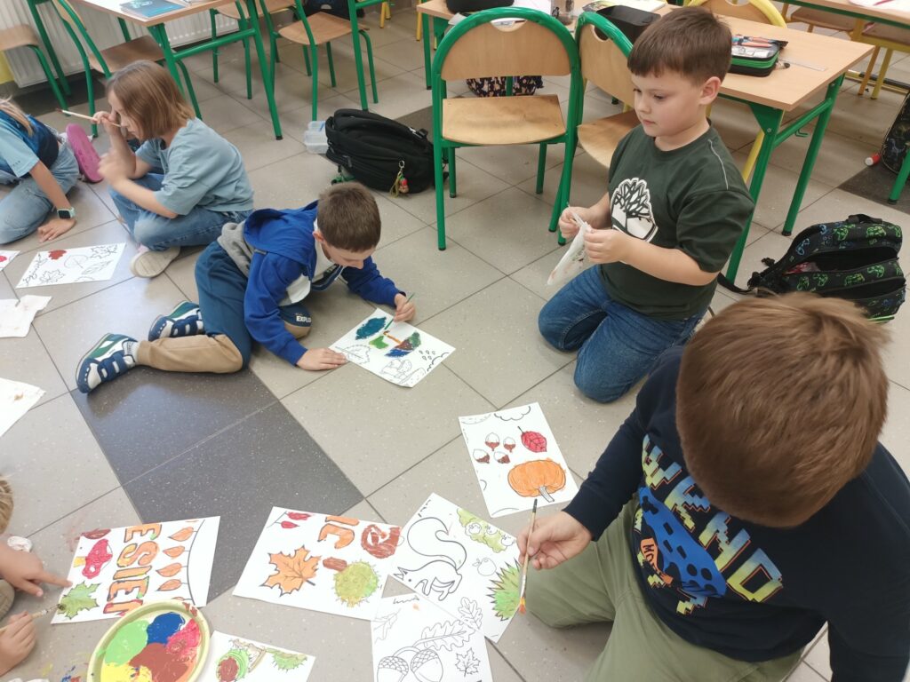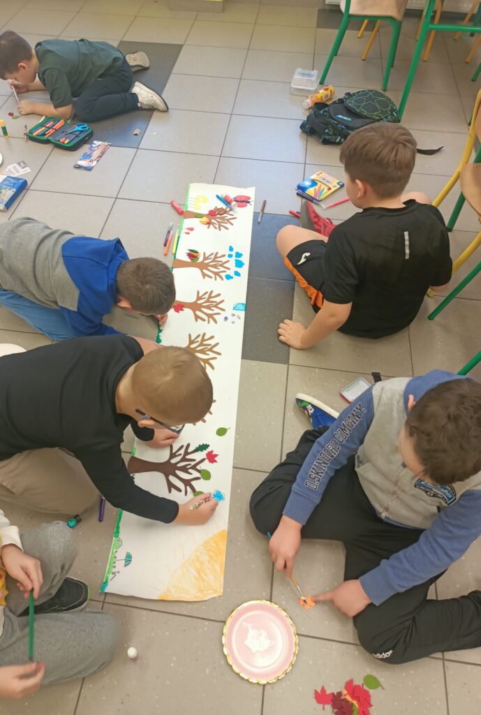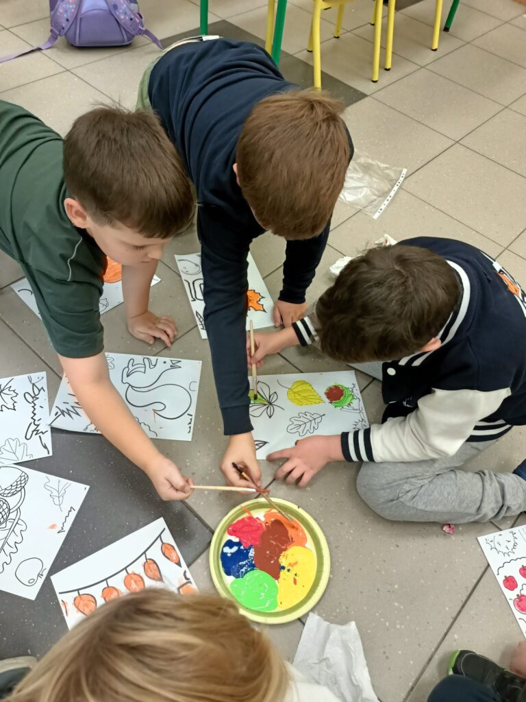 Niektórym jesień może wydawać się smutna i ponura. My lubimy tę porę roku. Uwielbiamy spadające liście i wszystko to, co dzieje się wokół – przebiegające alejami wiewiórki, spacery po parku, jesienne kolory, które pobudzają nas do kreatywności i twórczej pracy. Tacy właśnie jesteśmy, zatracamy się w pięknie świata i całej przyrodzie, lubimy tworzyć, malować, a przede wszystkim jednoczyć się w naszych wspólnych klasowych działaniach:)
