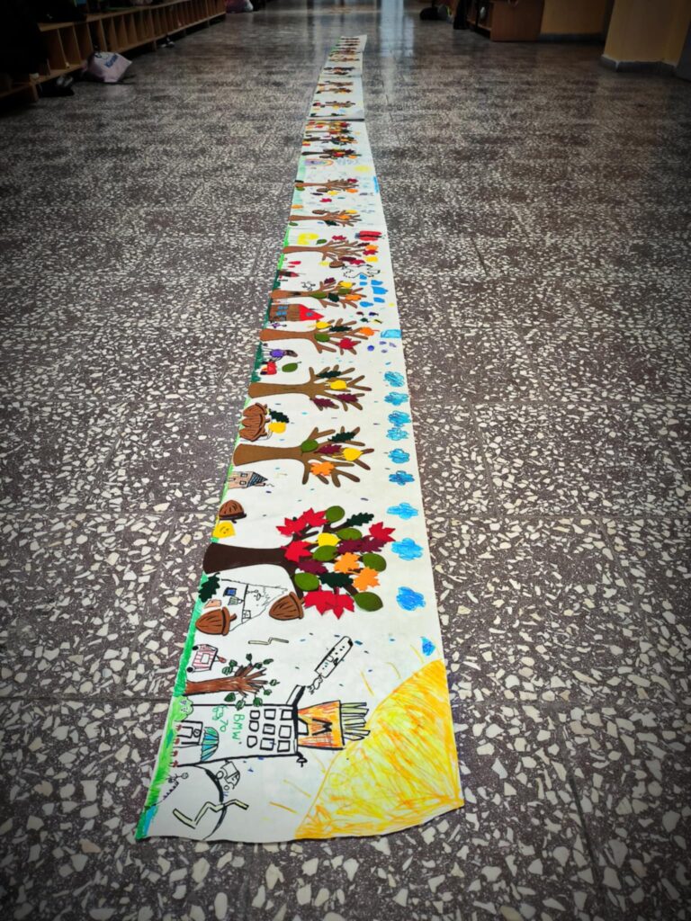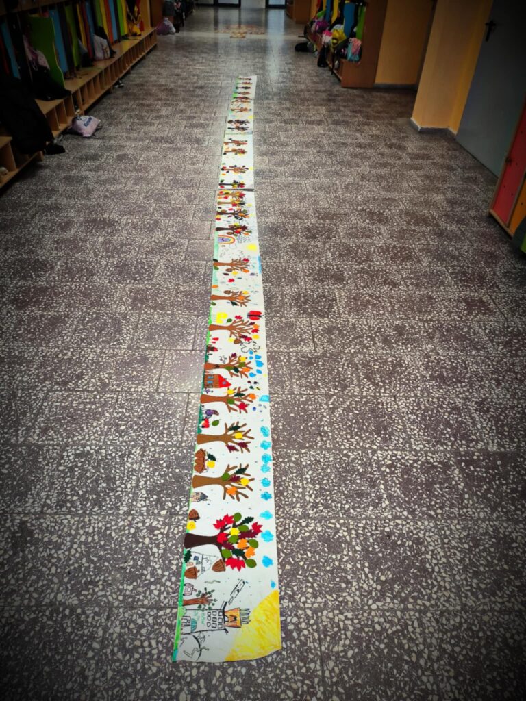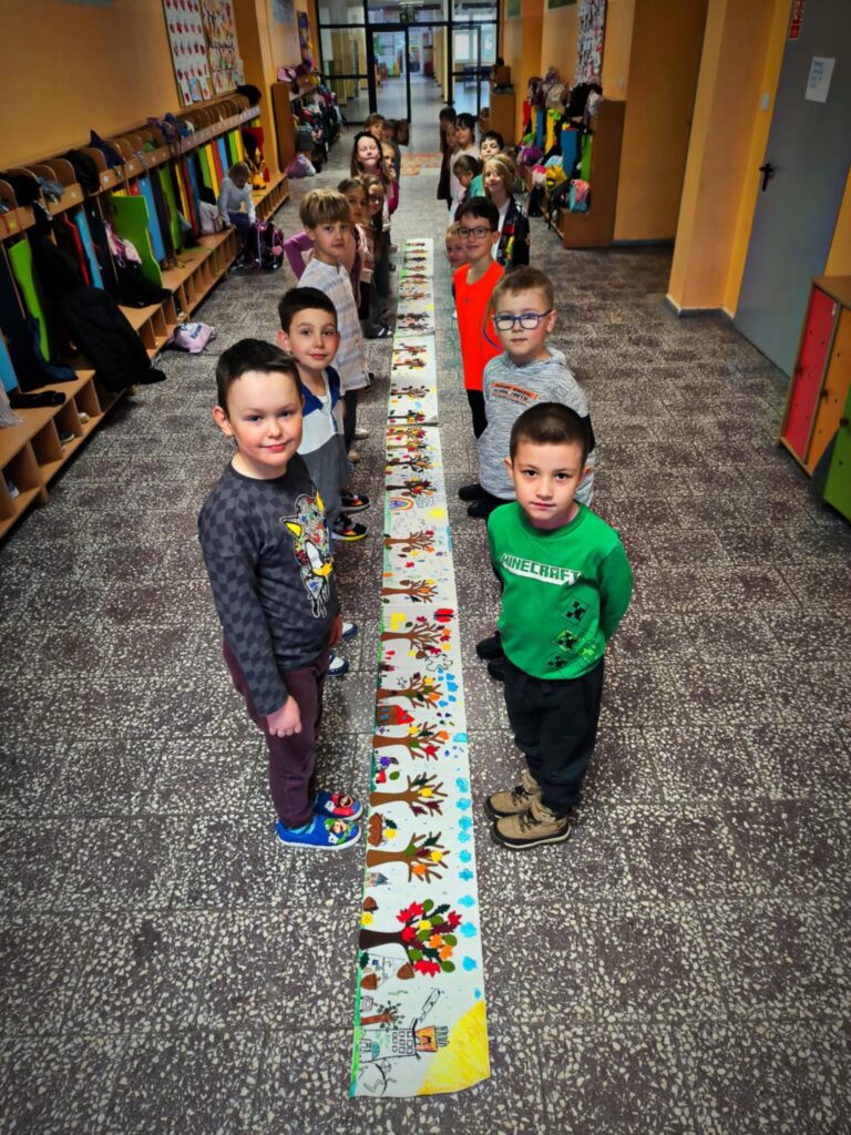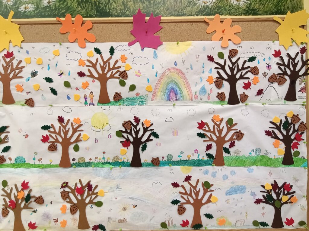 Jesień to magiczna i pełna kolorów pora roku. Natura zmienia się dynamicznie i inspiruje małych artystów do tworzenia barwnych i ciekawych prac plastycznych. Podczas naszych zajęć dzieci poznają różne techniki plastyczne i doskonale bawią się tworząc swoje dzieła. Ostatnio stworzyły kilkumetrowy DYWAN JESIENIĄ MALOWANY.