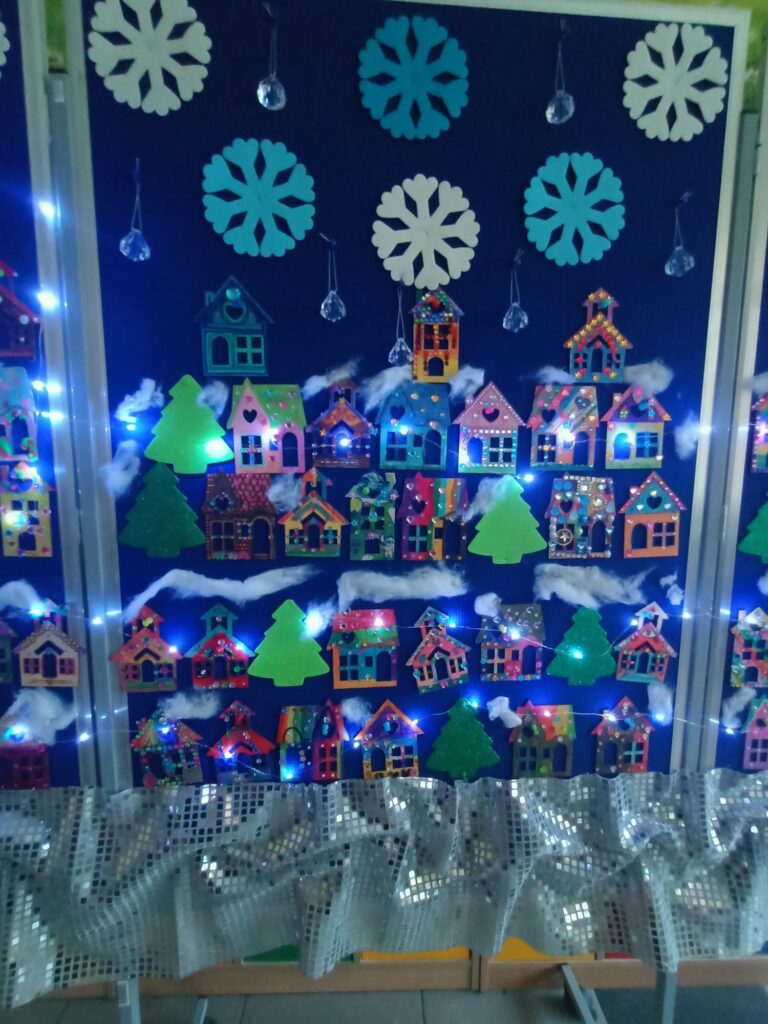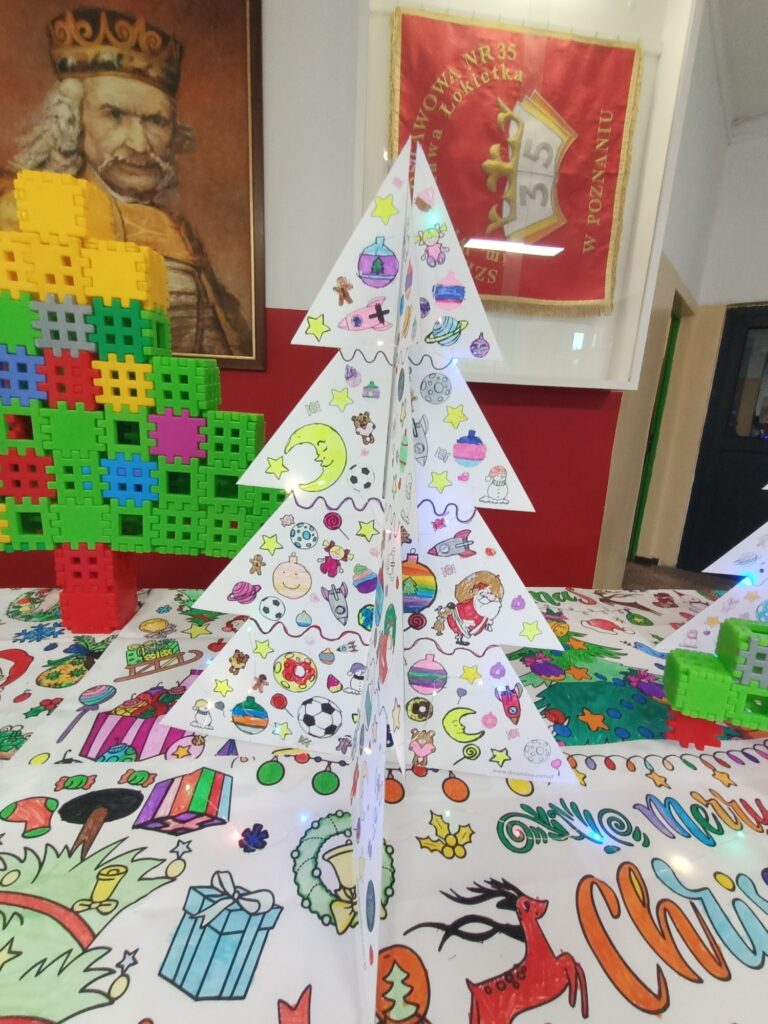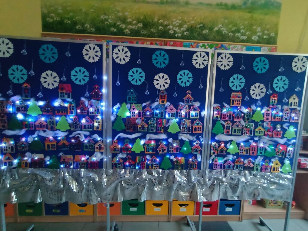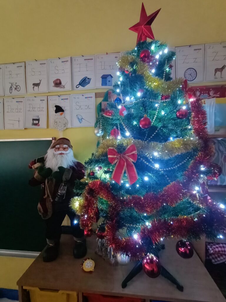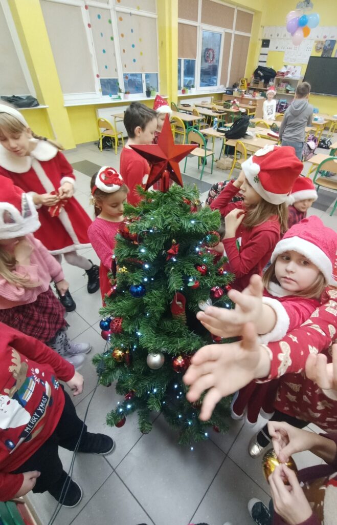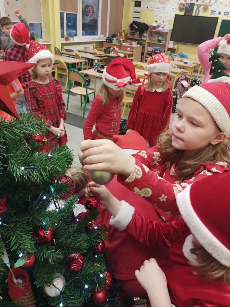 Od pierwszych dni grudnia uczniowie klasy 1A przygotowywali się do świąt, na które czekają z niecierpliwością. Na początek wspólnie udekorowaliśmy choinkę, która wygląda jak królowa, a nasza sala wypełniła się już świątecznym blaskiem. Niezapomnianym przeżyciem było spotkanie ze świętym Mikołajem, który obdarował nas upominkami. Kolejnym krokiem, który wprowadził nas w atmosferę świąt było wykonanie ciekawych ozdób świątecznych na klasową gazetkę. Zwieńczeniem świątecznych przygotowań była wystawa „Zimowe Miasteczko”. To piękna dekoracja, która zdobi hol główny naszej szkoły. Humory dopisują wszystkim, ponieważ czujemy, że święta już blisko!!!