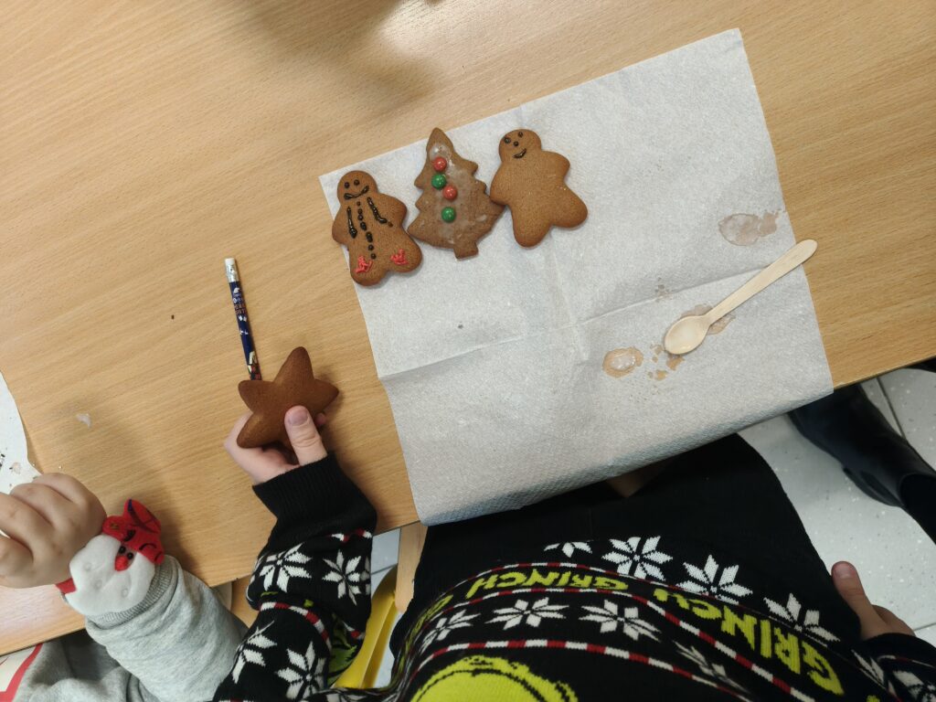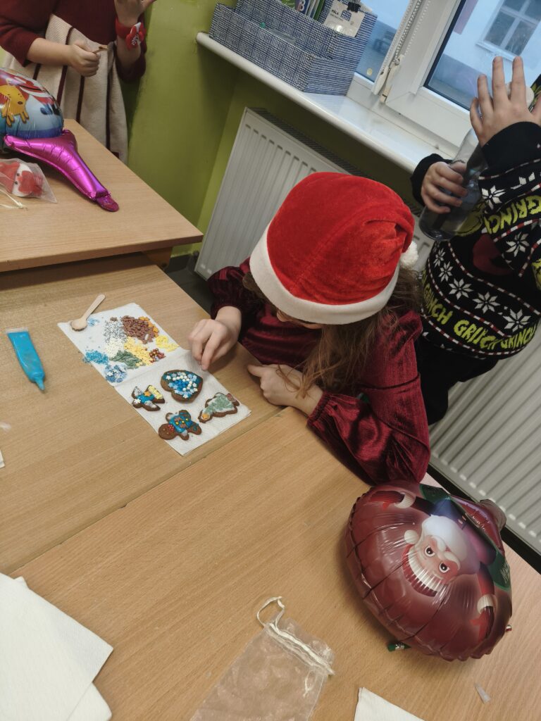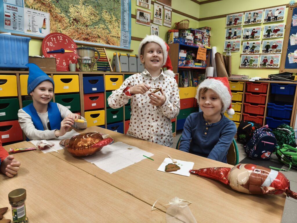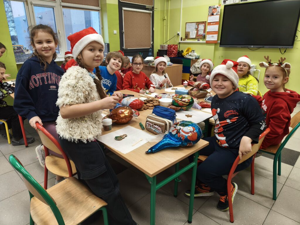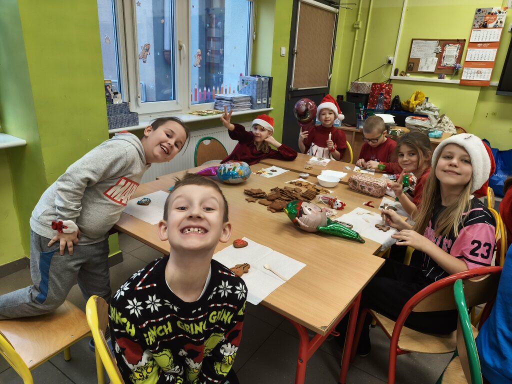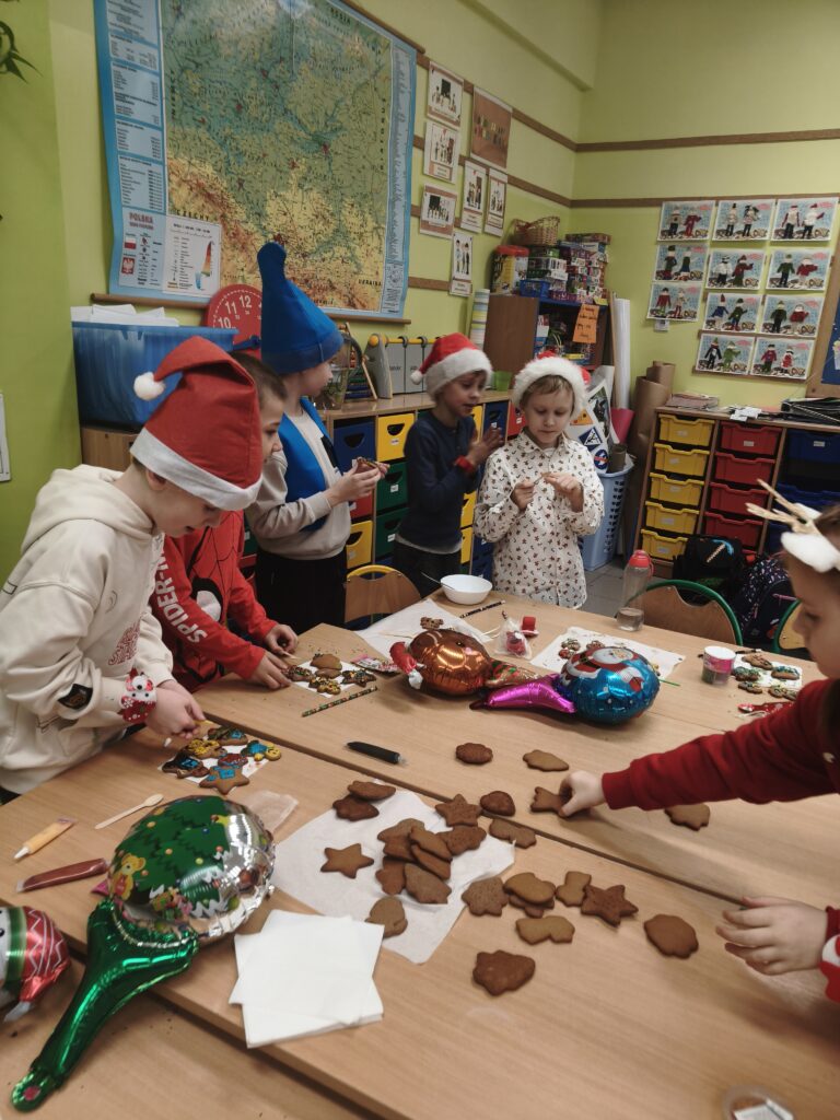 Dzisiejszy dzień upłynął nam w prawdziwie świątecznym nastroju! Podczas klasowych Mikołajek ozdabialiśmy pyszne pierniki, tworząc kolorowe i słodkie dzieła sztuki. W tle towarzyszyły nam ulubione piosenki świąteczne, które wprowadziły wszystkich w magiczny klimat.