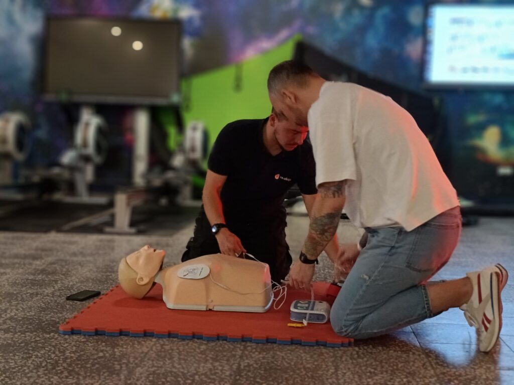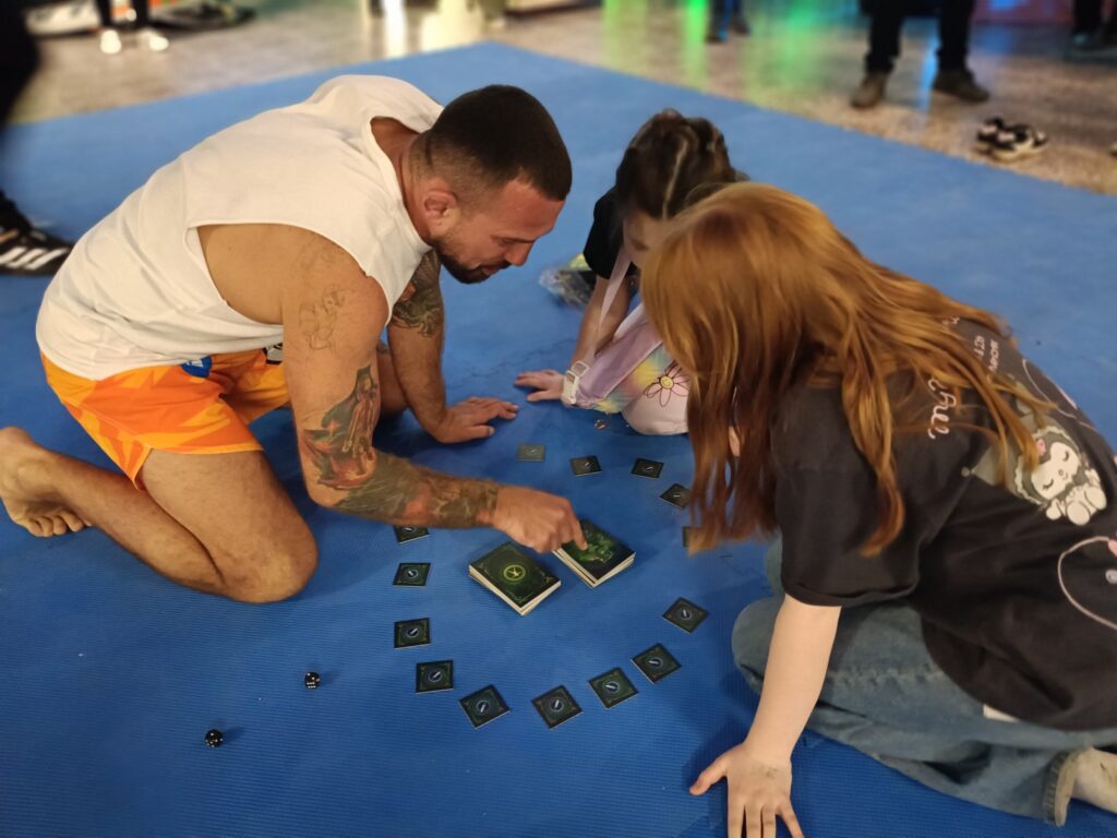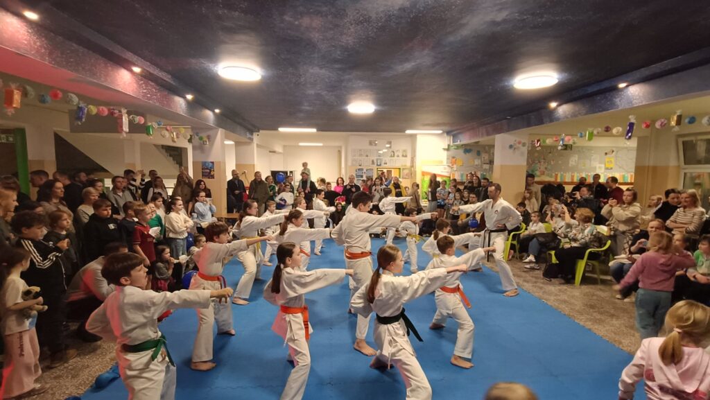 Na głównym holu zarówno dzieci jak i dorośli mogli zatańczyć razem z p. Renią oraz wziąć udział w pokazie pierwszej pomocy z Fundacją re.akcja. Po pokazie każdy mógł w jednej sali osobiście razem z ratownikami spróbować swoich sił ratując fantoma. O godzinie 18.00 zawodnicy karate i judo z karate Nihon oraz Judo Fox zaprezentowali swoje umiejętności. Można było zobaczyć jakie różnice są między tymi dwoma sztukami walki. Ok. godziny 18.45 mieliśmy przyjemność gościć niezwykłych sportowców – zawodników MMA oraz windsurfingu – naszych byłych uczniów – p. Borysa Mańkowskiego, p. Kacpra Paciorkowskiego oraz p. Jakuba Janika. Opowiedzieli kilka słów o sobie i walkach MMA, ale przede wszystkim zaprezentowali walkę i sposoby uderzeń. Robi wrażenie! Pan Borys sprzedawał także dla Felusia napisaną autorską książkę oraz grę karcianą. Całość ze sprzedaży przeznaczył na rehabilitację i badania Felusia.