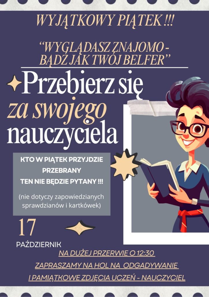 Trwając w tygodniu Dnia Edukacji Narodowej, w pierwszy w tym roku wyjątkowy piątek, Samorząd Uczniowski zaprasza, aby przebrać się lub ucharakteryzować w taki sposób, by przypominać nauczyciela z naszej szkoły. Na dużej przerwie o 12:30 zapraszamy wszystkich Uczniów i Nauczycieli na wspólne odgadywanie i pamiątkowe zdjęcia Nauczyciel – przebrany Uczeń.
