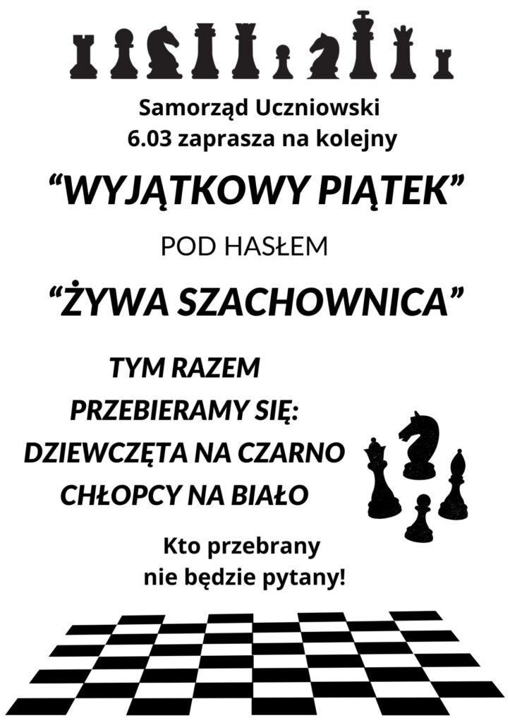 Z okazji zbliżającego się Dnia Patrona – króla Władysława Łokietka – w tym tygodniu, w środę, zostanie rozegrana królewska gra w szachy i tym samym zapraszamy na kolejny wyjątkowo zwariowany piątek, podczas którego nie wszyscy muszą umieć grać w szachy, a mogą stać się ich częścią będąc pionkami szachowymi. Szczegóły na plakacie w załączniku!