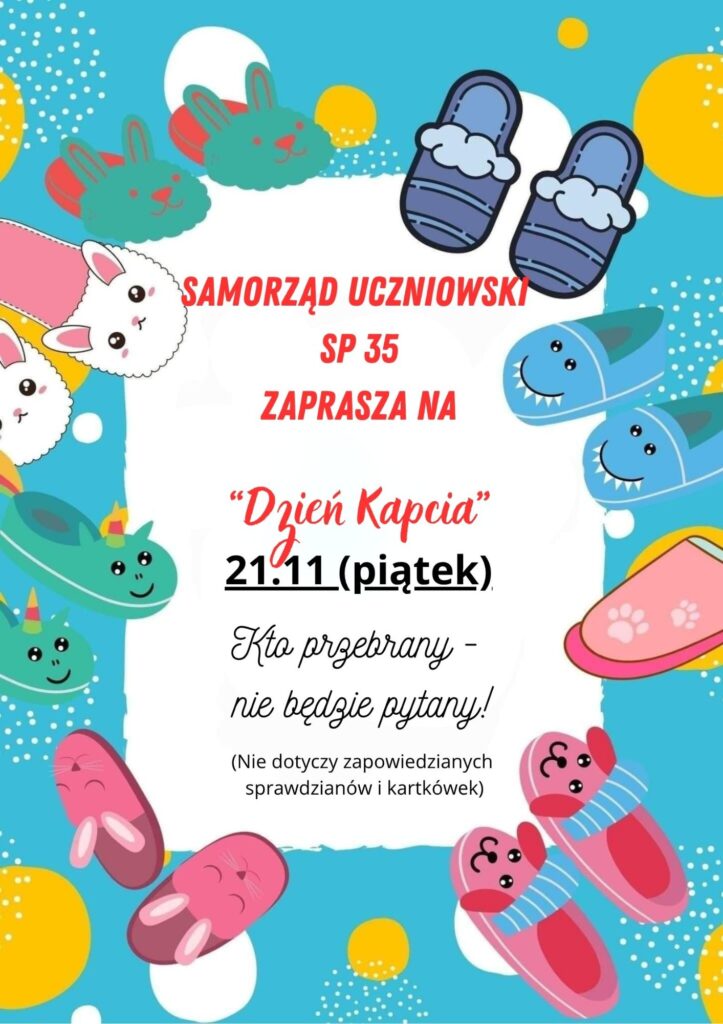 Samorząd Uczniowski zaprasza na kolejny wyjątkowy piątek, tym razem „Dzień Kapcia”. Zamieńmy naszą szkołę w przytulne miejsce przypominające domowe zacisze. Przynieście swoje ulubione kapcie i swobodnie chodźcie w nich po szkole. To świetna okazja, by połączyć wygodę z zabawą 🙂 Na dużej przerwie zapraszamy wszystkich z oryginalnymi kapciami na pamiątkowe zdjęcie 🙂