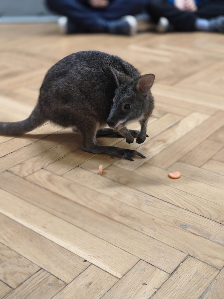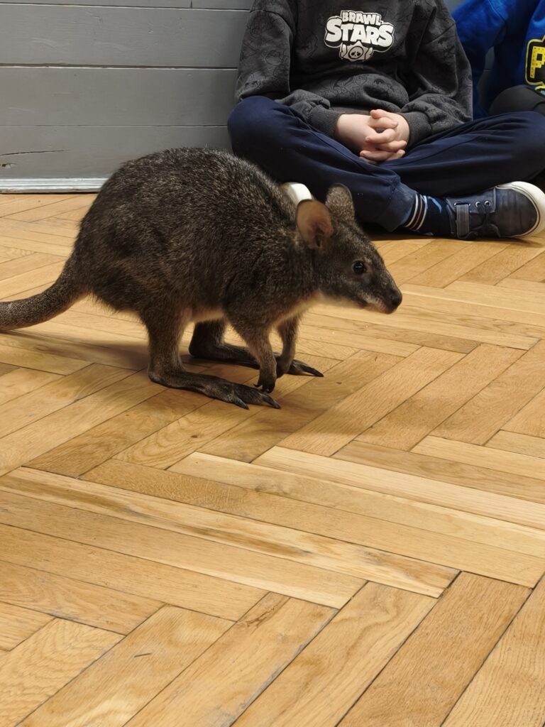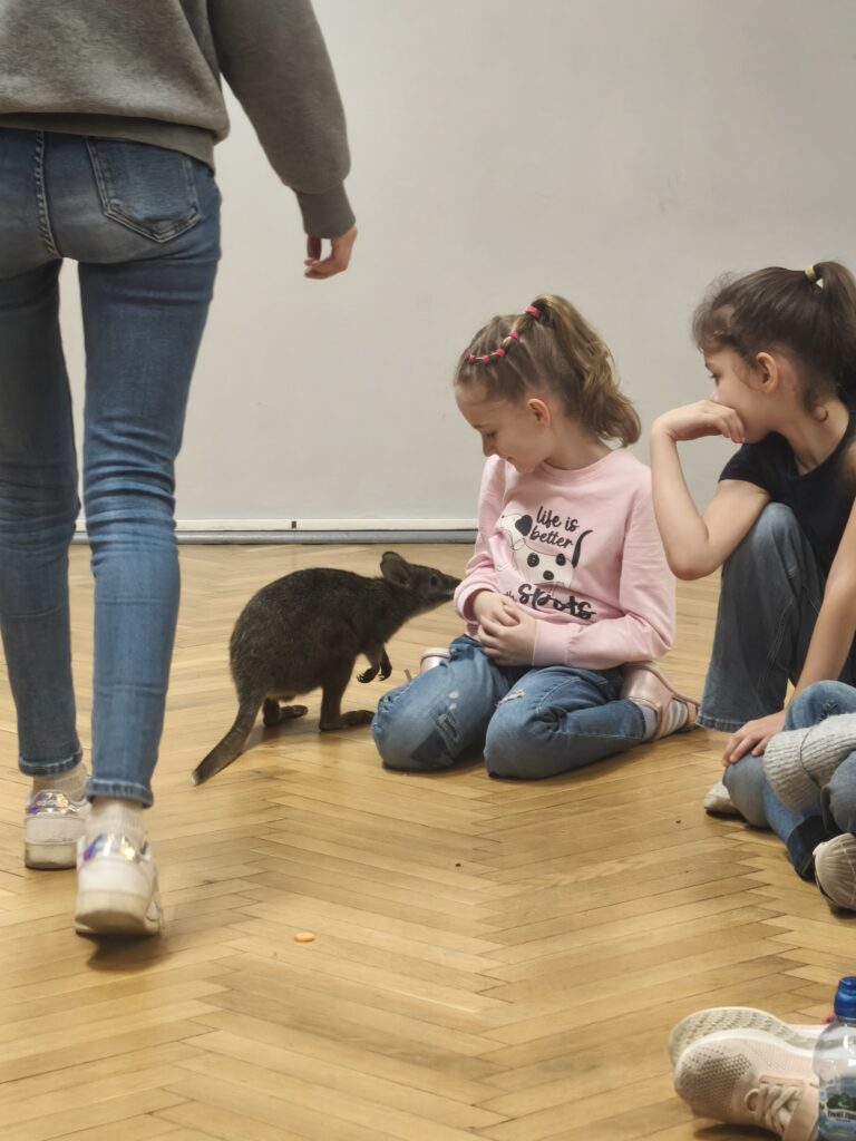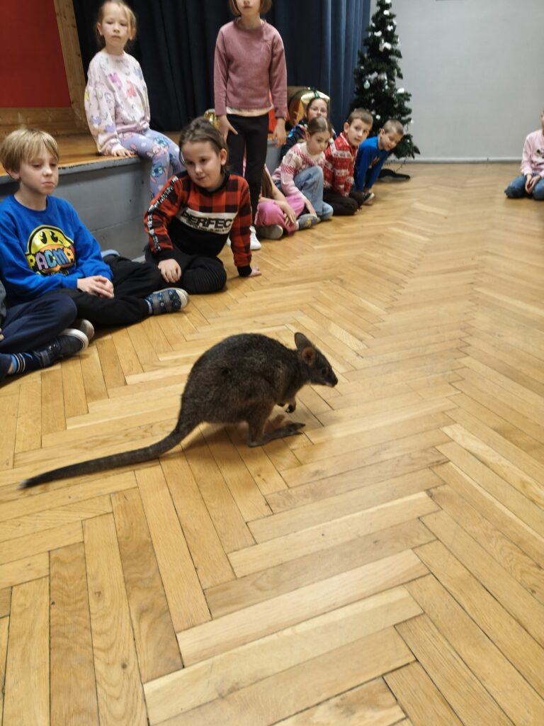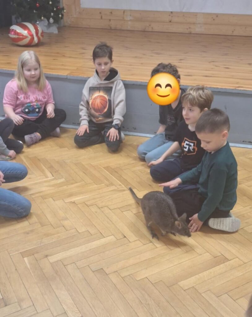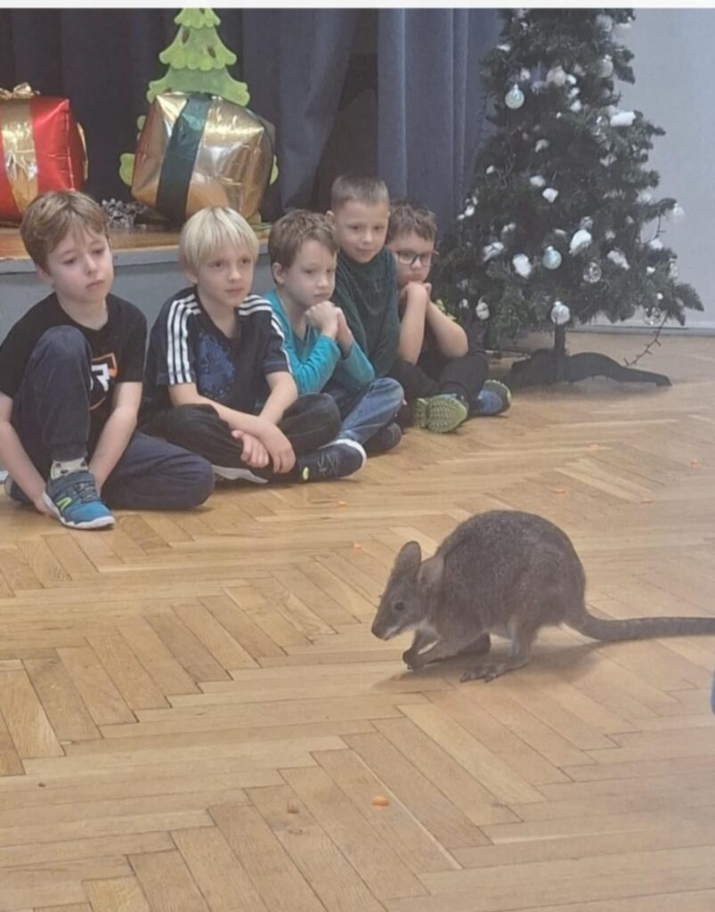 Kolejne spotkanie klas młodszych w ramach „żywych lekcji” dostarczyło uczniom wielu niezapomnianych wrażeń. Tym razem naszym wyjątkowym gościem był kangur, który wzbudził ogromne zainteresowanie i radość wśród dzieci.